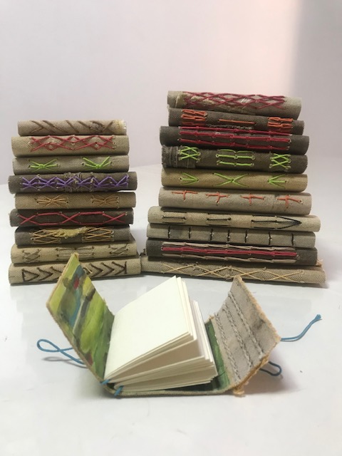 Cadernos feitos à mão, tamanhos e folhas diversas. Encadernados com costura manual, e contra capa feita com aquarela.
