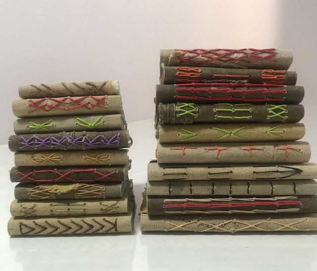 As costuras são variadas e feitas à mão. A contra capa com pinturas em aquarela. Os papeis podem ser diversos, dependendo da intenção do caderno, podendo ser, por exemplo, com papel de sketch ou próprio para aquarela.